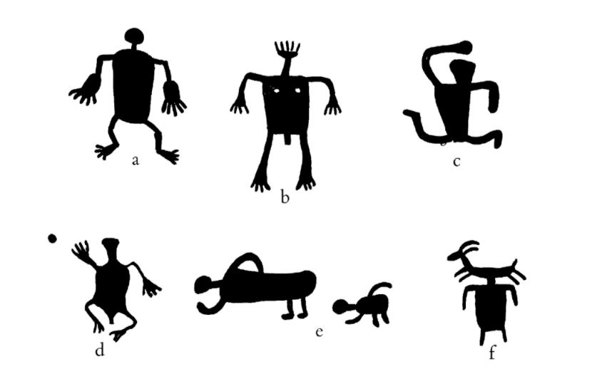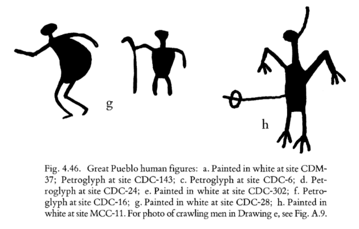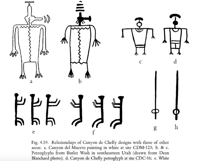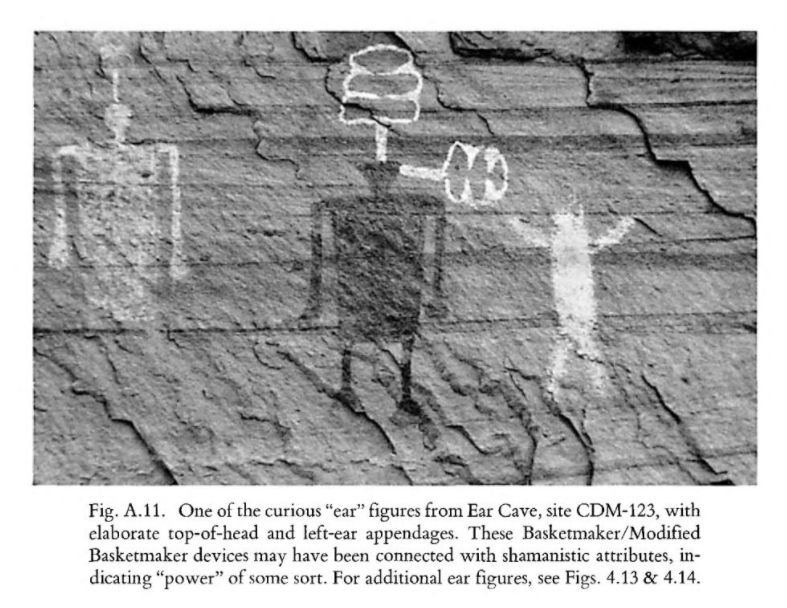 Lo más provocativo del las pinturas del cañon de Anasazi son las grandes figuras humanas con ornamentos encima de la cabeza y apéndices en la oreja izquierda. Se encuentran figuras idénticas en petroglifos del área de Cutler Wash en Utah. Estos apéndices podrían estar conectados con atributos chamicos según Grant (1978:261).
