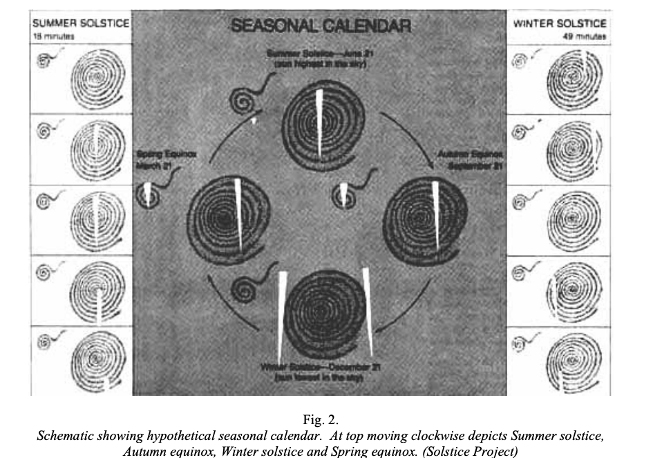 Hace una sombra en el centro de la espiral cuando el sol se levanta hasta y llega a la posición de la luna llena cada 19 años, biseccionando los 19 anillos de la espiral. Es decir, usando la cimbra y la luz los indios observaban el mínimo y el máximo extremo del sol y de la luna. Esto indica conocimientos astronómicos, herramientas y capacidades de investigación y sobre la física de las superficies curvas.