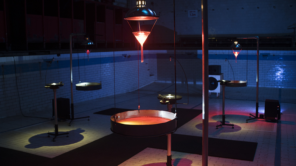 An abandoned swimming pool provided the original setting for the premiere of Phase Transition, a sculptural sound installation raising awareness of global climate change and the greenhouse effect. Blocks of ice melt at rates determined by climate-change data, their drips resonating in water-filled metal vessels. The dripping of meltwater blends with metallic sounds engraved on vinyl and played on customised turntables which turn faster and slower in accordance with the rate of melt, generating throbbing, fluctuating low frequency tones. As visitors explore the swimming pool, it fills not with water but with sonic waves that ebb, flow, rise up and subside in unguessable patterns.
