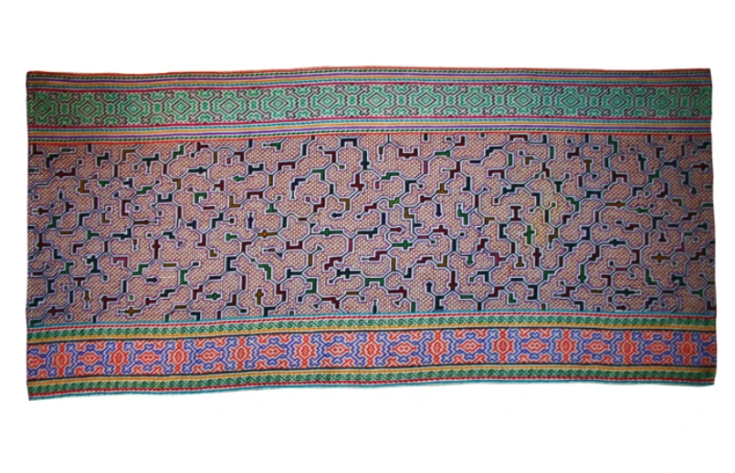 During an ayahuasca ceremony with a shaman named Sulmira Vela, Harris spied an interesting tapestry. Harris asked about the significance of the tapestry and Sulmira told her about a custom in which a Shipibo shaman lives for months in isolation and ingests different plants in order to connect with the spirits of the plants. According to Sulmira, each plant has a different personality, just like people. Once a plant is ingested, the shaman may be inspired to write a song. These songs, known as icaros, are then used in healing ceremonies, and eventually translated into geometric patterns in order to adorn tapestries with their messages.